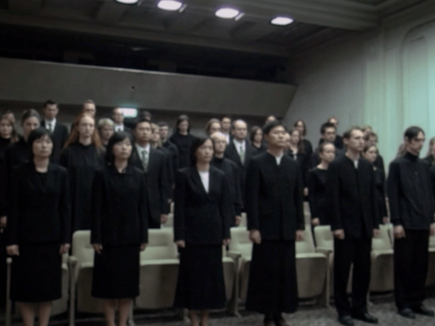 Inside a strange building, a choir performs. Again and again, they gather for a purpose only they seem to understand.